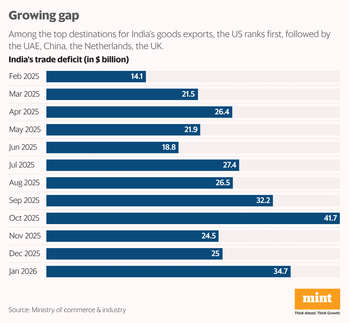 Exports slipped to $36.56 billion month-on-month, while imports surged to $71.24 billion, widening the gap. Shipments to the US moderated in January but remained strong cumulatively, reflecting exporters’ ability to adapt despite pricing pressures. Bilateral trade with China also expanded, underscoring India’s continued reliance on Chinese inputs.