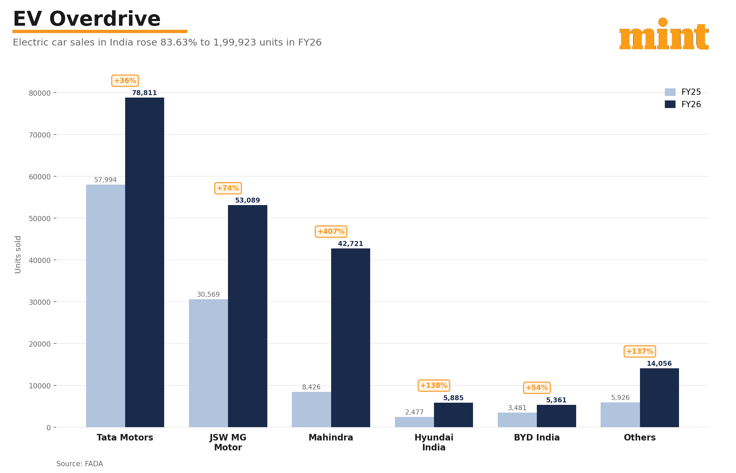 EVs are punching above their weight in India’s car market. Though they account for just 4% of total passenger-vehicle sales, EVs contributed nearly one-fifth of the growth in Fiscal 2026, helping Mahindra & Mahindra Ltd. and Tata Motors PV Ltd. overtake Hyundai to claim the No.2 and No.3 rankings.
